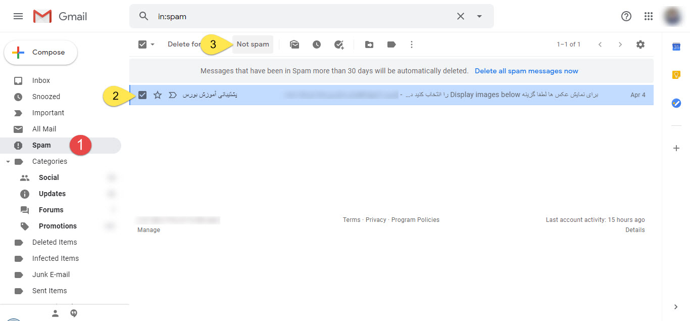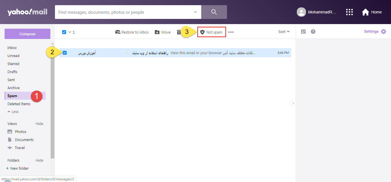 گزینه Not spam را انتخاب کنید و ایمیل به پوشه inbox انتقال خواهد یافت.